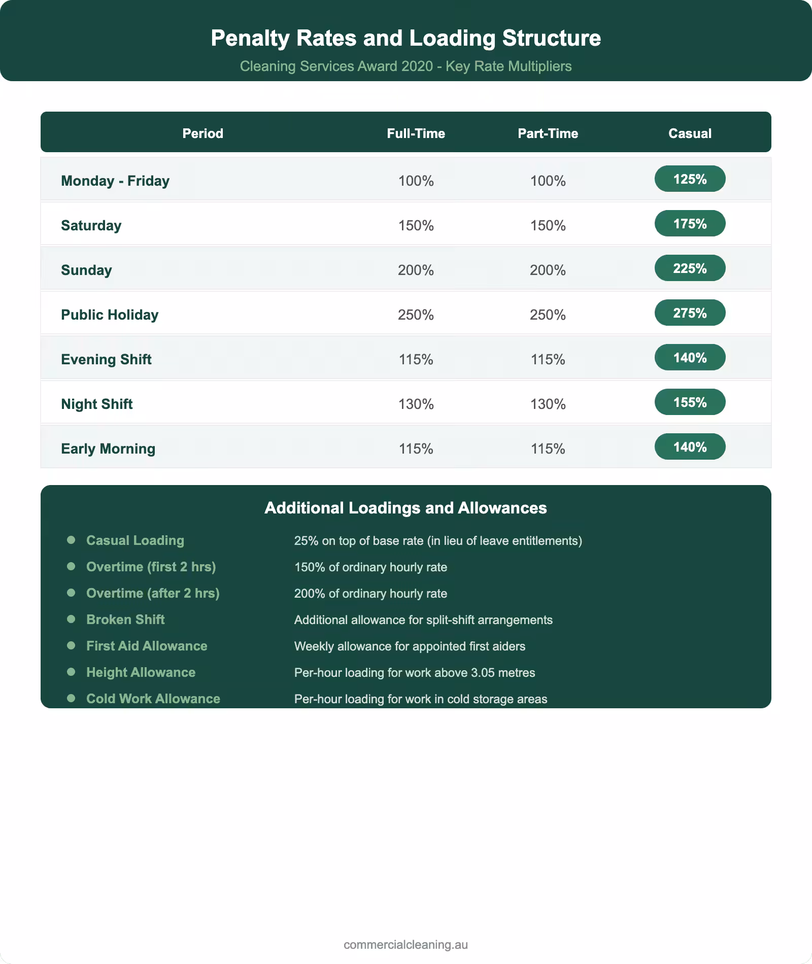 We factor several award allowances into our contract pricing. The Cleaning Services Award provides a broken shift allowance of $3.24 per broken shift, a first aid allowance of $17.53 per week for appointed first aiders, a cold places allowance for work in refrigerated environments below zero degrees, and a toilet cleaning allowance of $2.87 per shift for cleaners whose primary duty involves toilet and amenity block servicing. Our Penrith team claims the toilet cleaning allowance on eight of twelve active sites, and the first aid allowance applies to three designated first aiders across the portfolio.