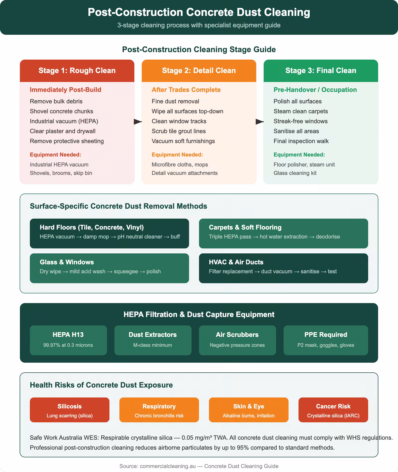 Yes. Concrete dust contains crystalline silica particles that are small enough to penetrate deep into the lungs when inhaled. Prolonged exposure to respirable silica dust is a known cause of silicosis, a serious and irreversible lung disease. We treat every concrete dust cleaning job as a health and safety task and use HEPA-filtered equipment and respiratory protection to confirm both our team and the building occupants are protected.