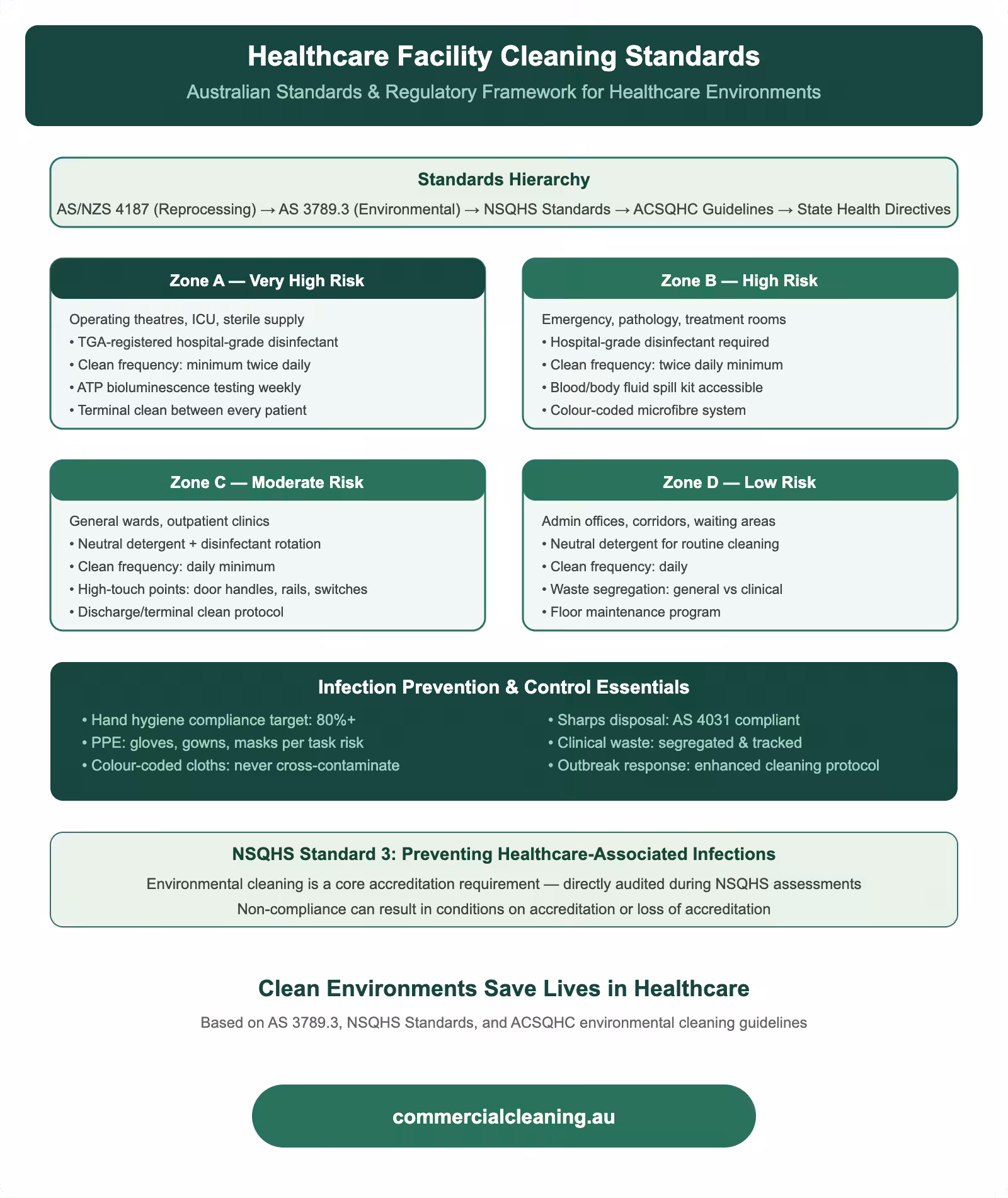 We handle a multi-layered regulatory framework that includes federal guidelines from the NHMRC, state-based health department policies, and facility-specific accreditation requirements under the National Safety and Quality Health Service standards. The NHMRC Australian Guidelines for the Prevention and Control of Infection in Healthcare provide the overarching framework that defines how cleaning fits within the broader infection prevention strategy. These guidelines establish that environmental cleaning is a critical component of standard precautions and must be performed to a level that minimises the risk of pathogen transmission from surfaces to patients, staff, and visitors.