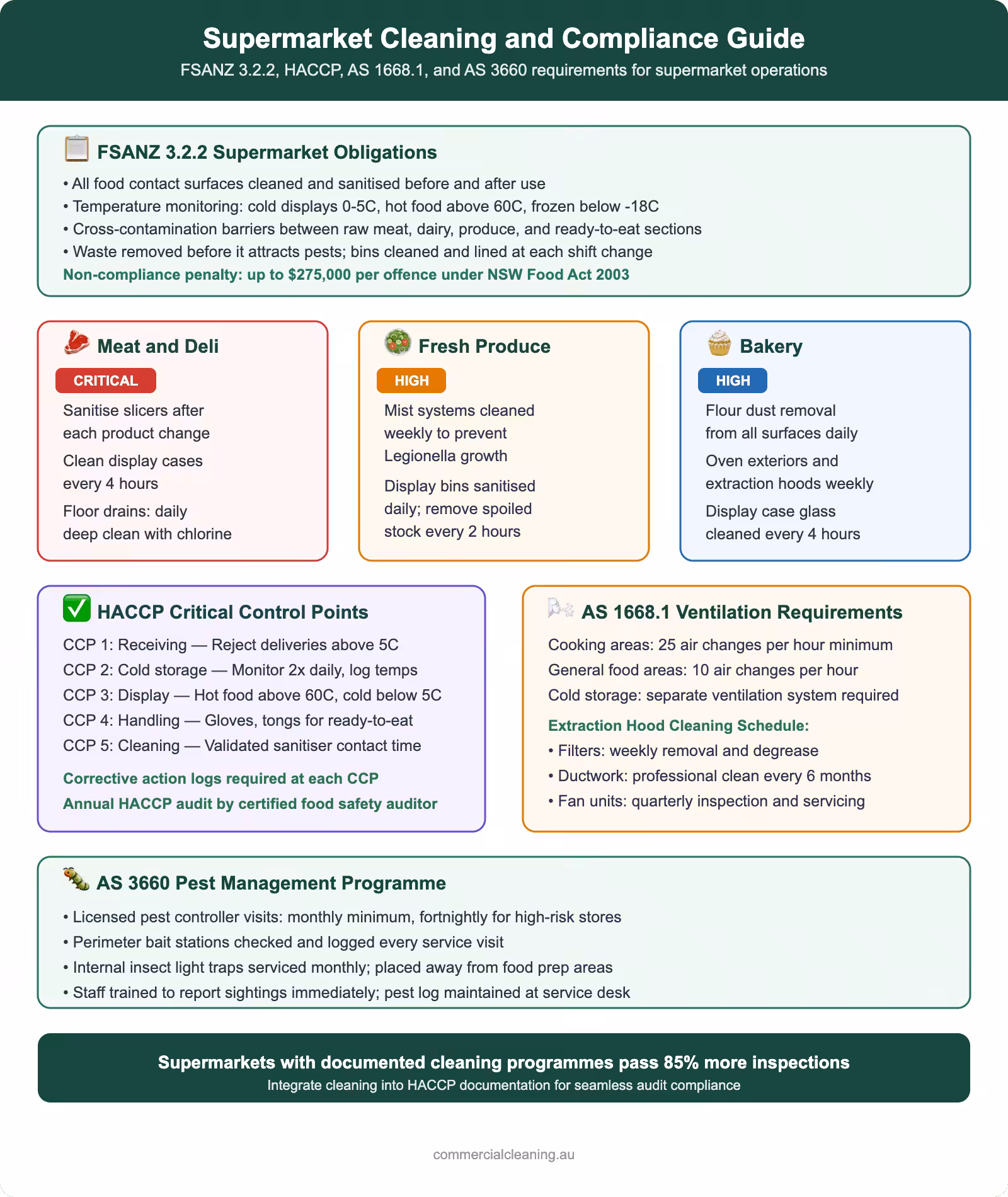 Supermarket cleaning is a specialised discipline requiring expertise in multi-area food service operations, retail contamination prevention, and regulatory compliance. Professional supermarket cleaning ensures compliance with FSANZ 3.2.2, NSW Food Authority standards, HACCP prerequisites, AS 1668.1 ventilation requirements, and AS 3660 pest management standards.