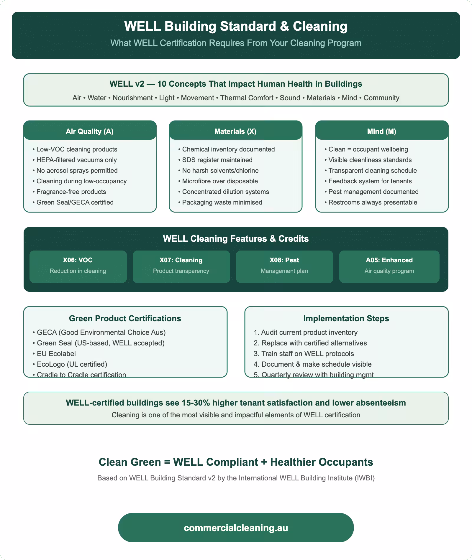 We have been cleaning buildings certified under the WELL Building Standard since the first Australian projects achieved certification, and the requirements are unlike anything else in the commercial cleaning industry. Our team at Clean Group provides sustainable office cleaning services sydney specifically designed to meet WELL’s rigorous benchmarks for air quality, water quality, and materials safety, and we have learned through direct experience that most cleaning companies simply do not understand what WELL certification demands. When a building pursues WELL certification, every cleaning product, every procedure, and every piece of equipment we use comes under scrutiny from the certification body, and we have built our entire green cleaning program around meeting these standards. For practical advice on cleaning layouts that demand flexible approaches, see our open plan cleaning guide.