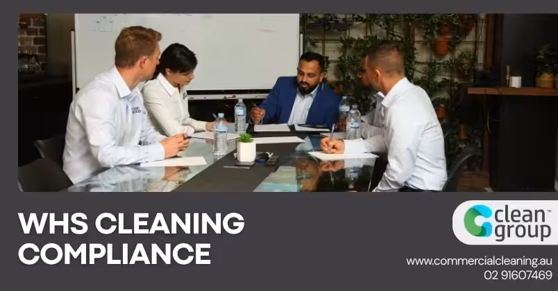 WHS cleaning compliance framework in NSW showing PCBU duties, worker obligations, top 5 risks, required documentation, and penalty structure
