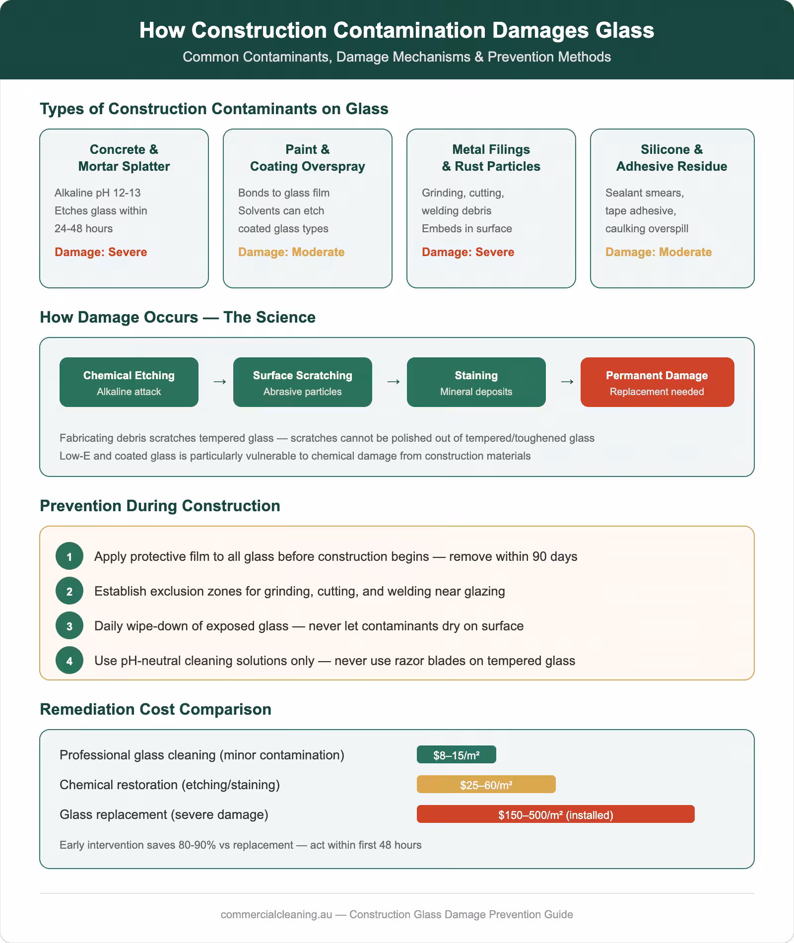 We have found that concrete, mortar, paint, adhesive, and sealant all bond to glass through different mechanisms requiring specific removal techniques. Incorrect methods, particularly abrasive approaches on dried concrete, cause permanent scratches that are more costly than the original contamination.